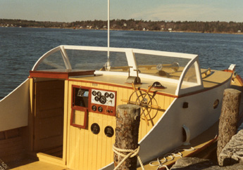 The engine is isolated from the boat by soft, vibration-absorbing mounts. Since these are too soft to take the engine thrust (the force that drives the boat), we use a separate thrust bearing and connect the engine to it by an Aquadrive™ shaft and two constant-velocity joints. This arrangement leaves the engine free to vibrate without transmitting that vibration to the boat, and, along with substantial sound insulation around the engine, assures quiet and smooth operation. She cruises comfortably in open water at 12 knots (top speed is about 17), and with her 50-gallon fuel capacity she can do it for over 20 hours at a stretch. | ||||||||||||||