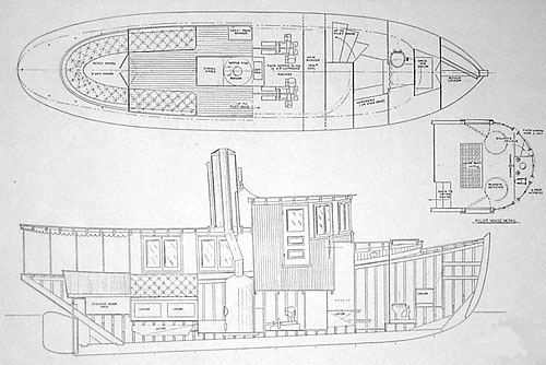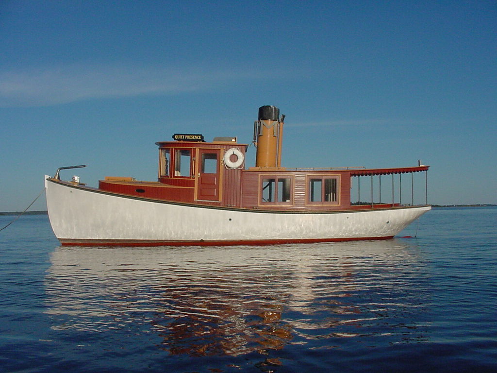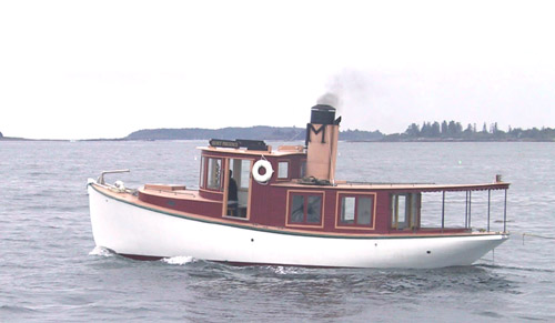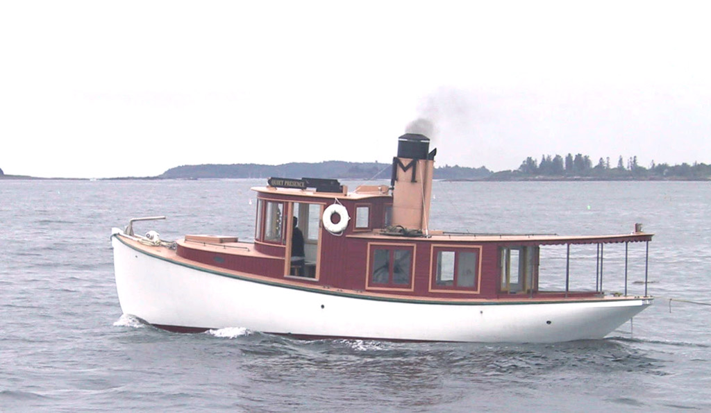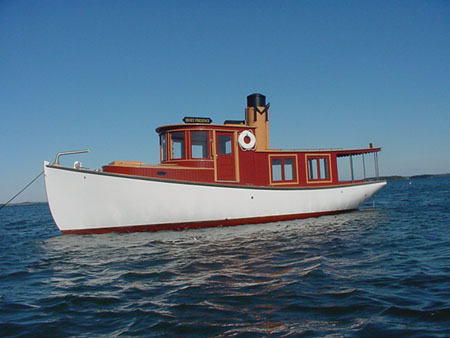 Reminiscent of the small passenger steamers that were still familiar sights on Maine's bays and lakes sixty years ago, this boat combines the quiet and simplicity of steam power with traditional yacht styling and joinery. Driven by twin Semple 3" x 5" x 4" V-compound engines, she is fitted-out with enough brass piping and valves to satisfy any engineer, but is designed to be run by one person from the pilothouse.